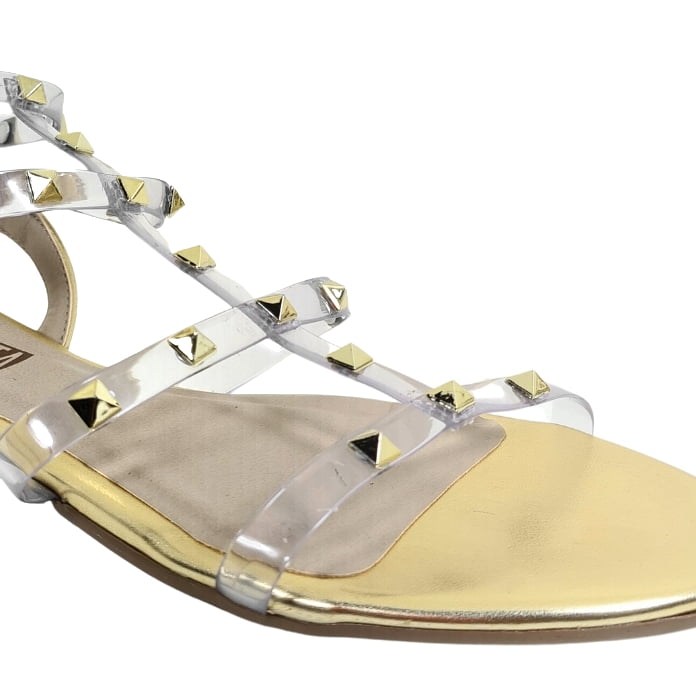 Rasteira feminina dourada com transparências em vinil.