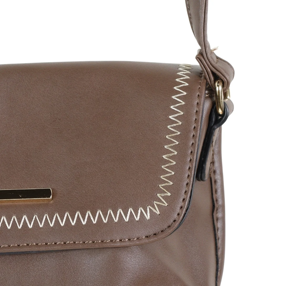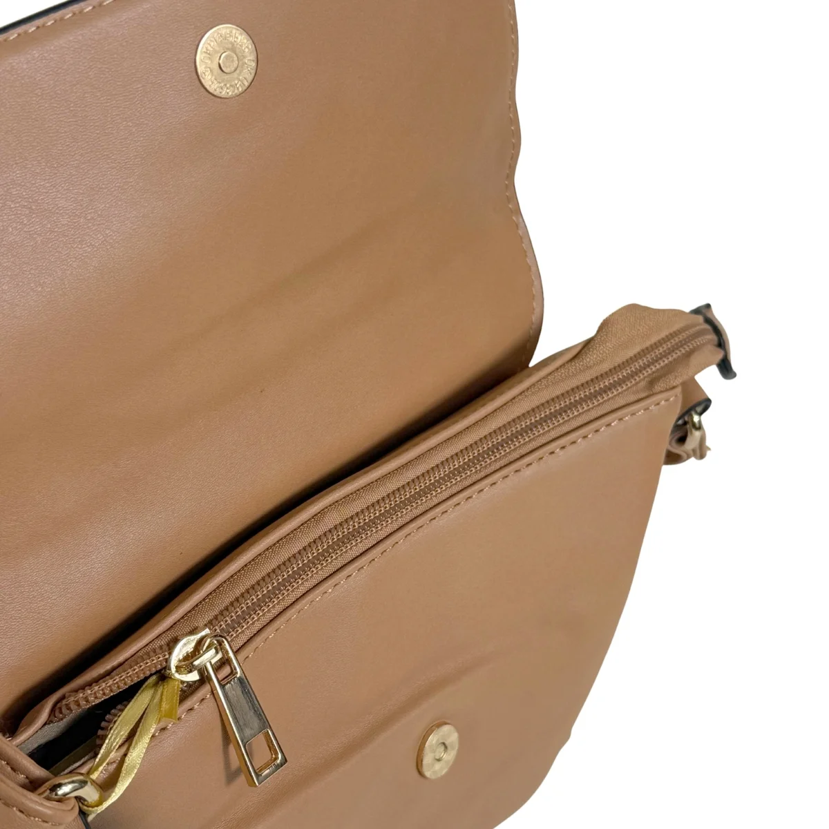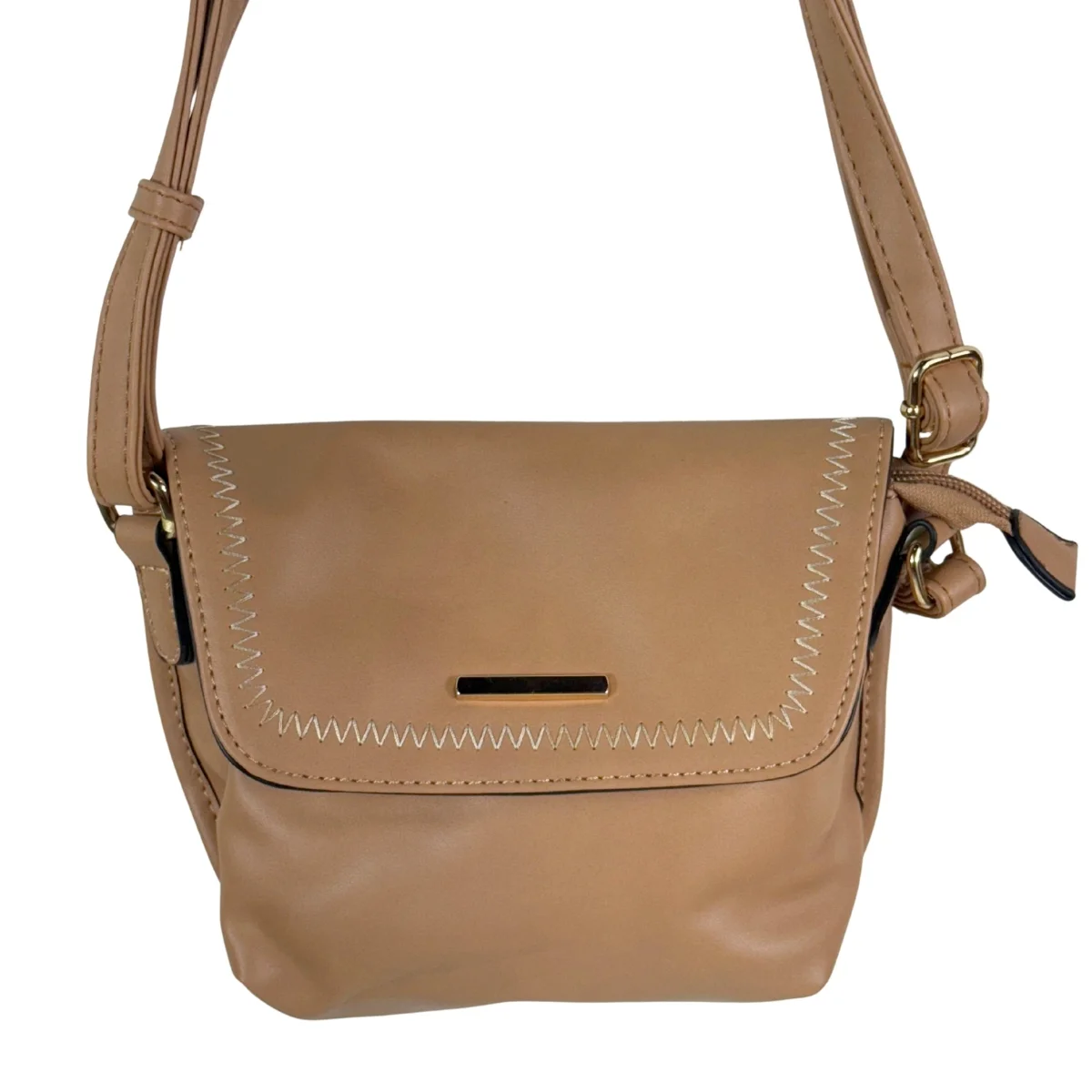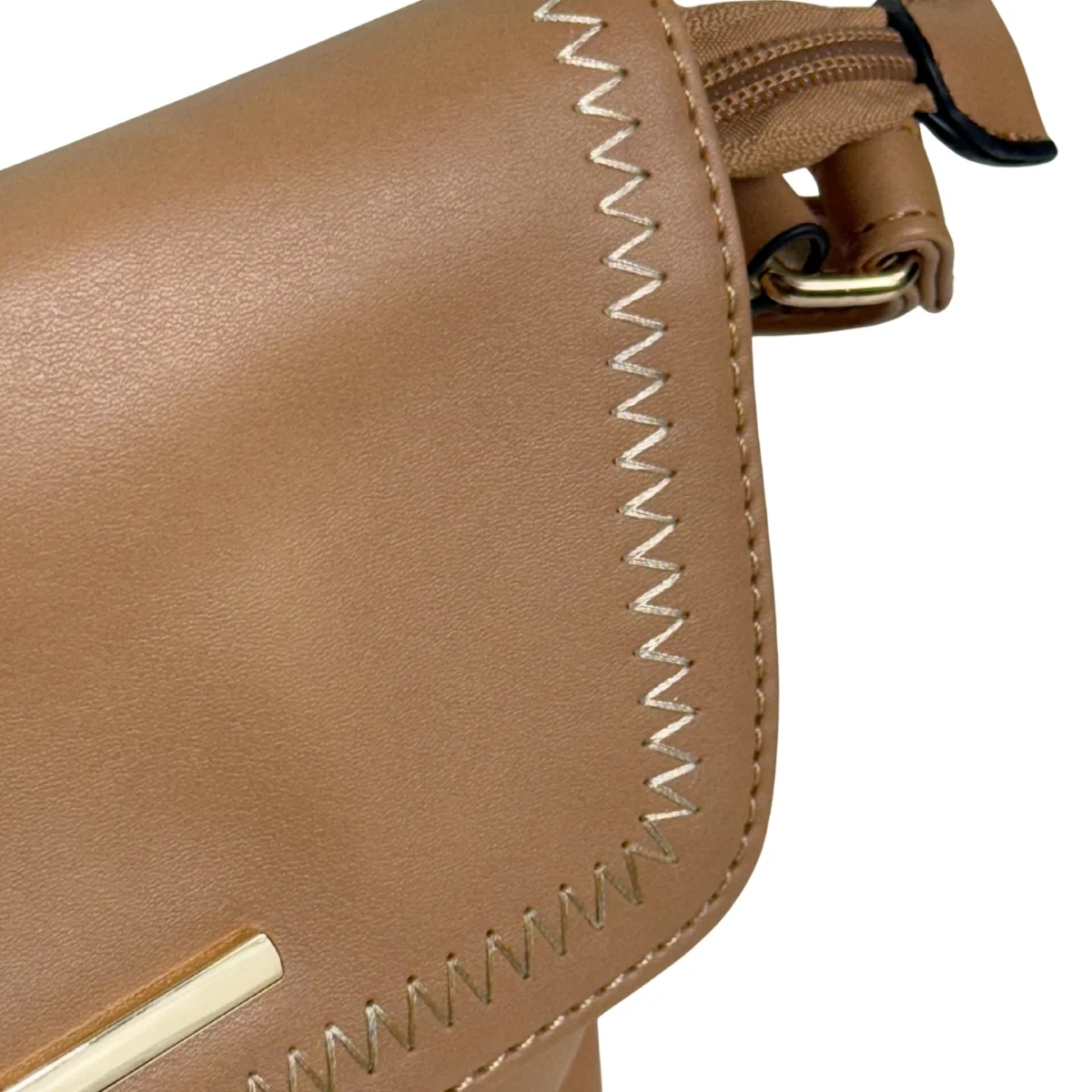 Bolsa feminina, modelo crossbody transversal, confeccionada em material sintético. Possui repartição única com fechamento por zíper e lapela com botão ímã, costura reforçada, alça transversal em tom contrastante, ajustável e não removível e costura no tom.