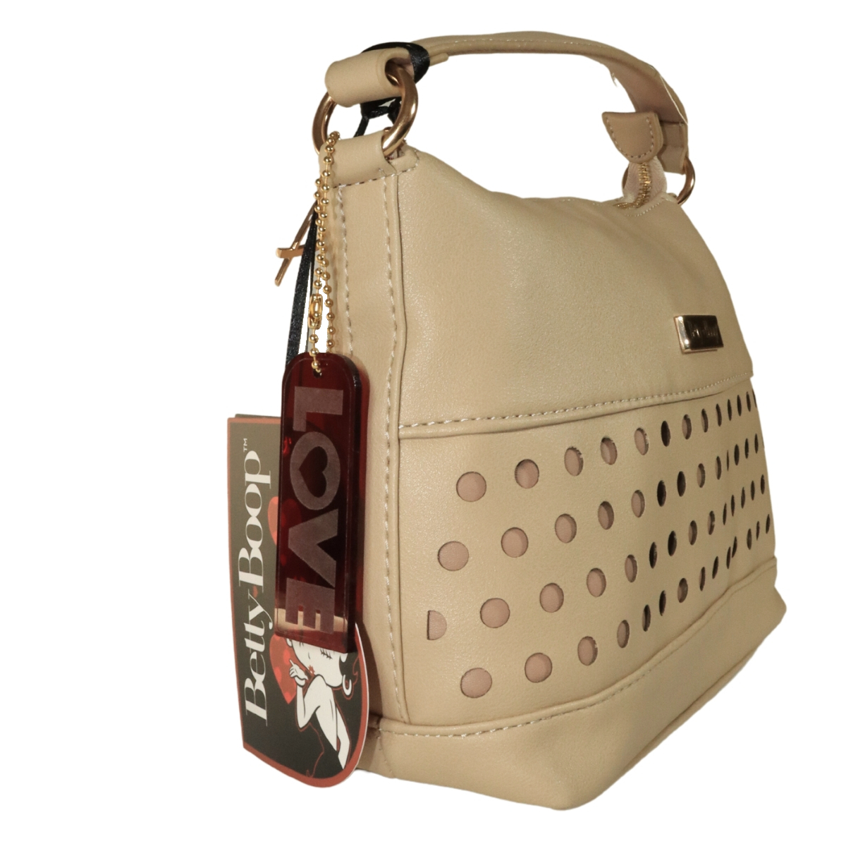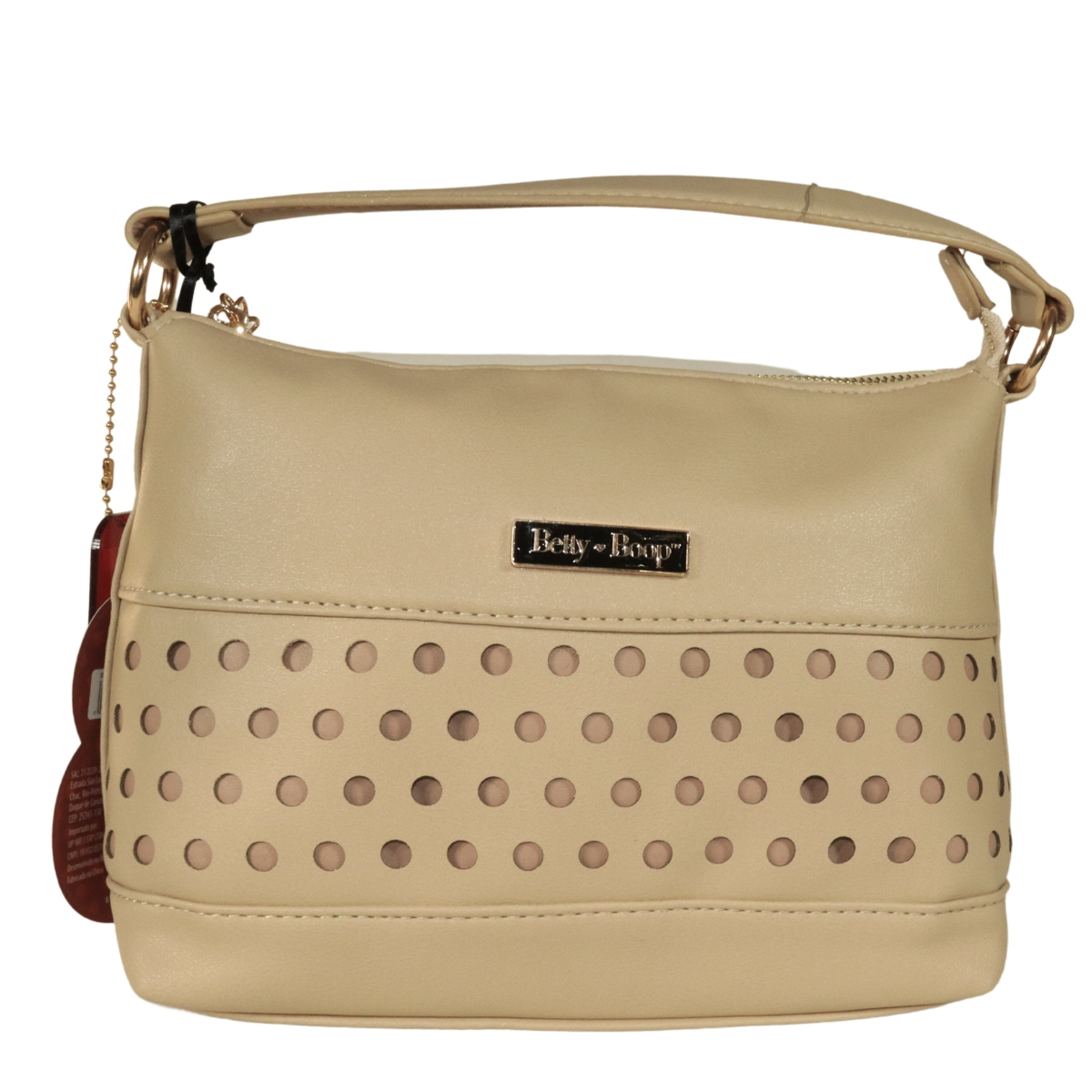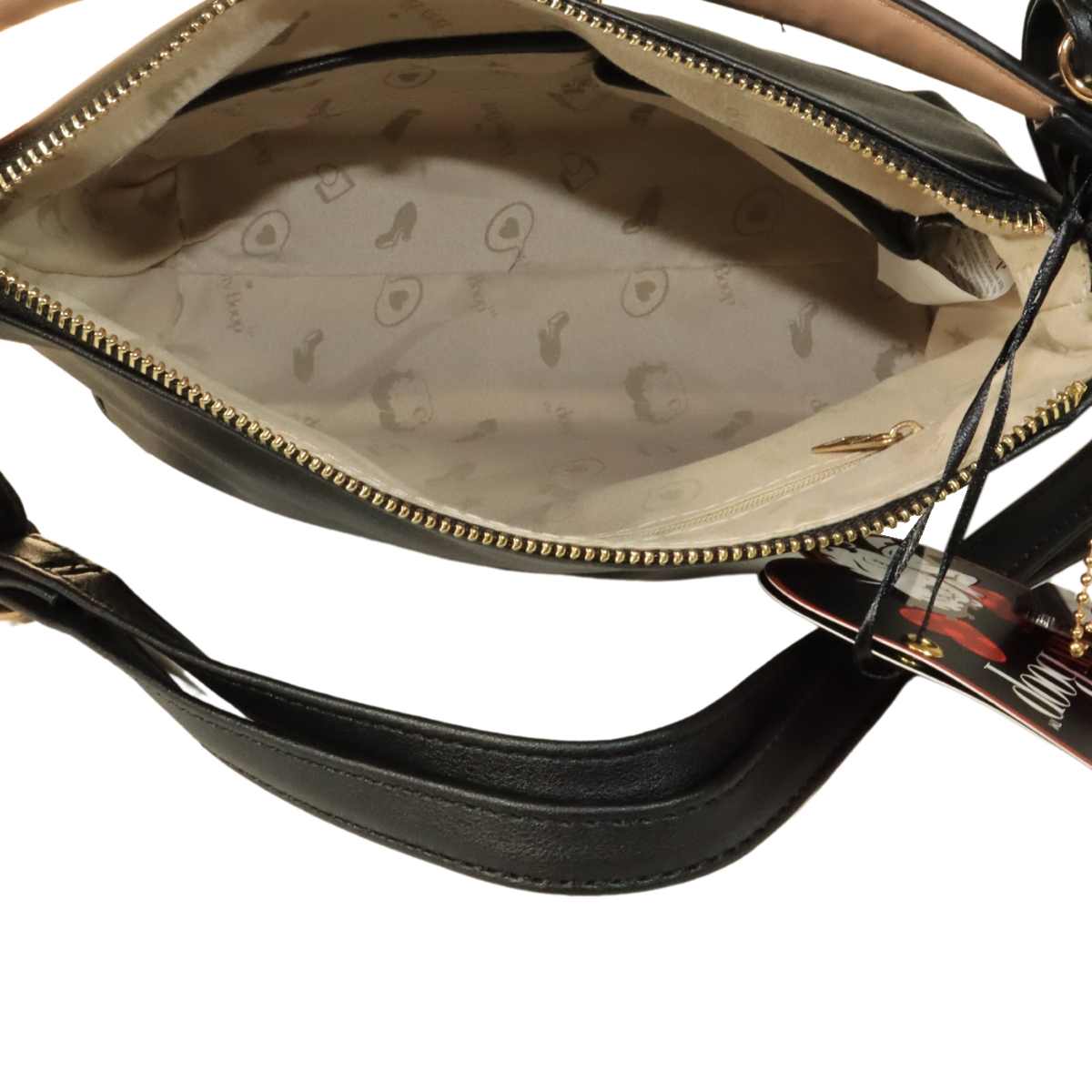 Bolsa com perfuração a laser frontal e forro bege com a logomarca Betty Boop dourada e preta. Fechamento principal com zíper personalizado com coração metálico gravado a marca Betty Boop em baixo relevo.