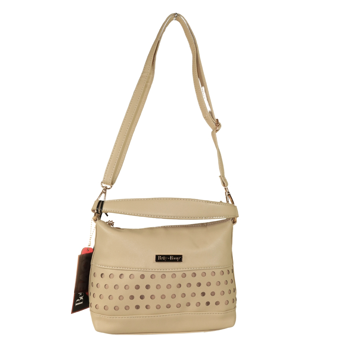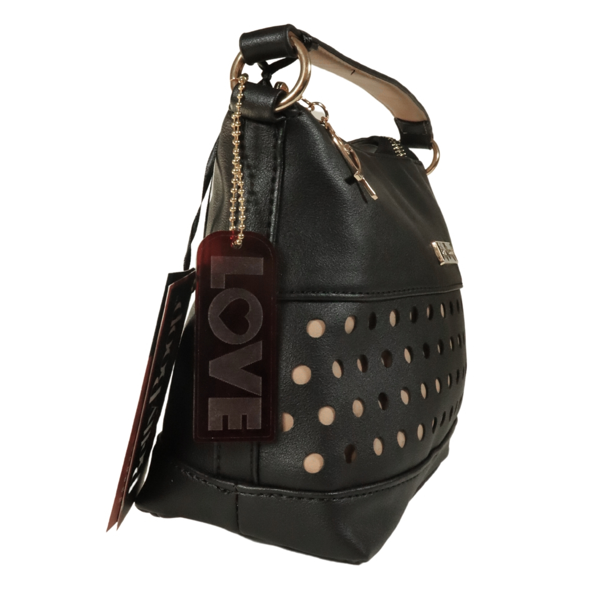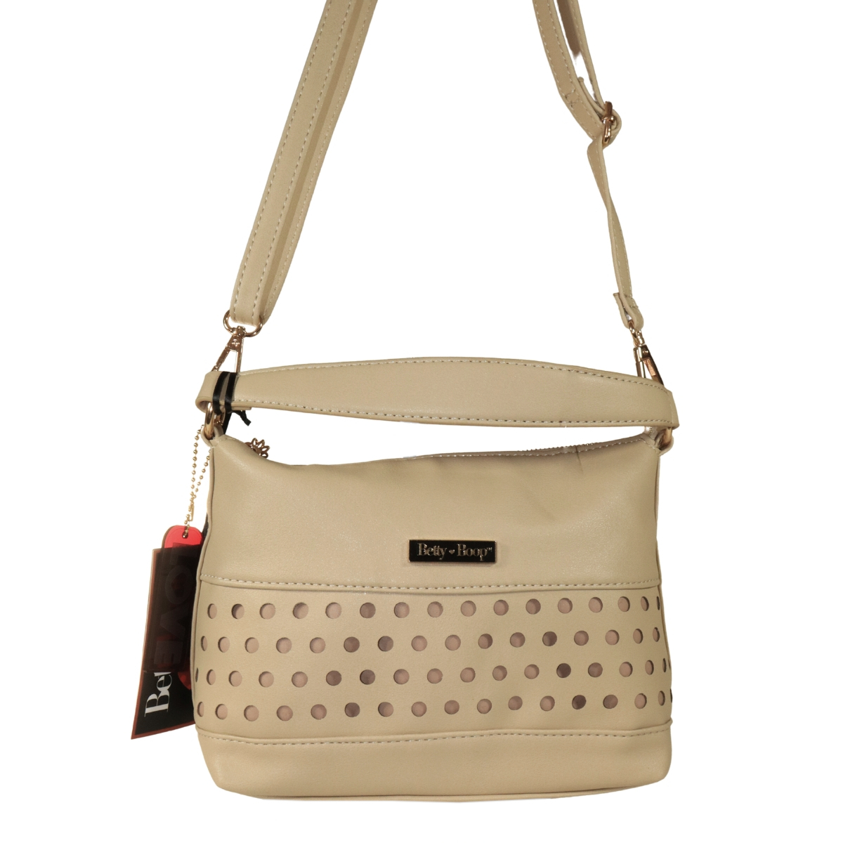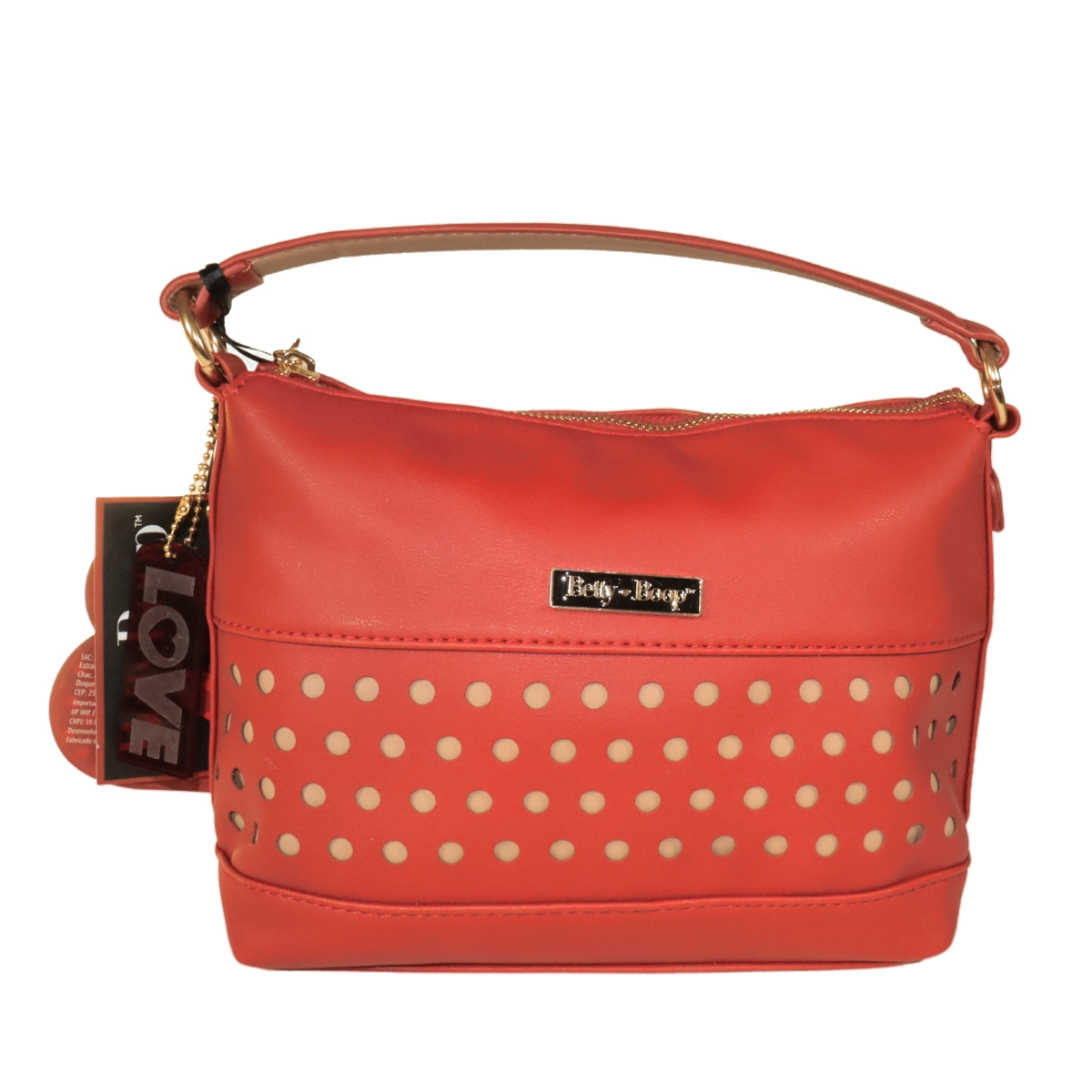 Bolsa com perfuração a laser frontal e forro bege com a logomarca Betty Boop dourada e preta. Fechamento principal com zíper personalizado com coração metálico gravado a marca Betty Boop em baixo relevo.