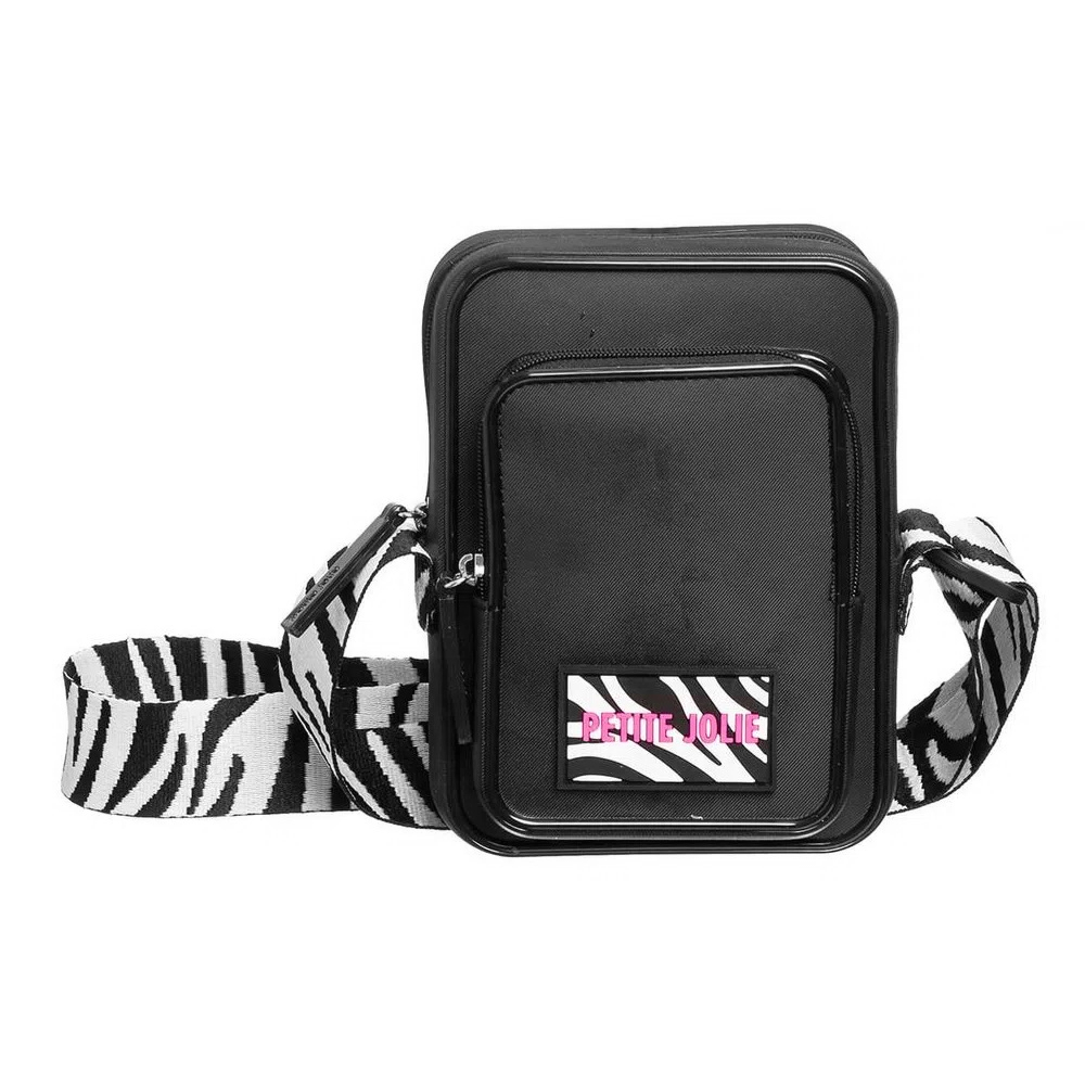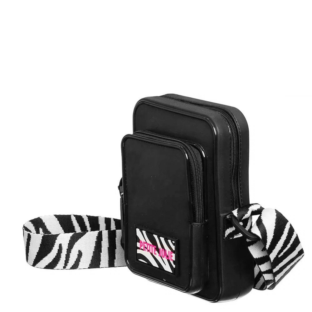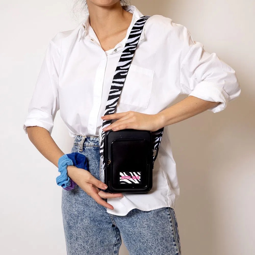 Bolsa pequena em formato retangular na cor preta. É feita em J-Lastic com textura de nylon e possui duas aberturas, uma maior e outra menor. Possui alça longa de gorgurão regulável com estampa de zebra. Com fechos em zíper e etiqueta com o nome da marca na capa, também com estampa de zebra.