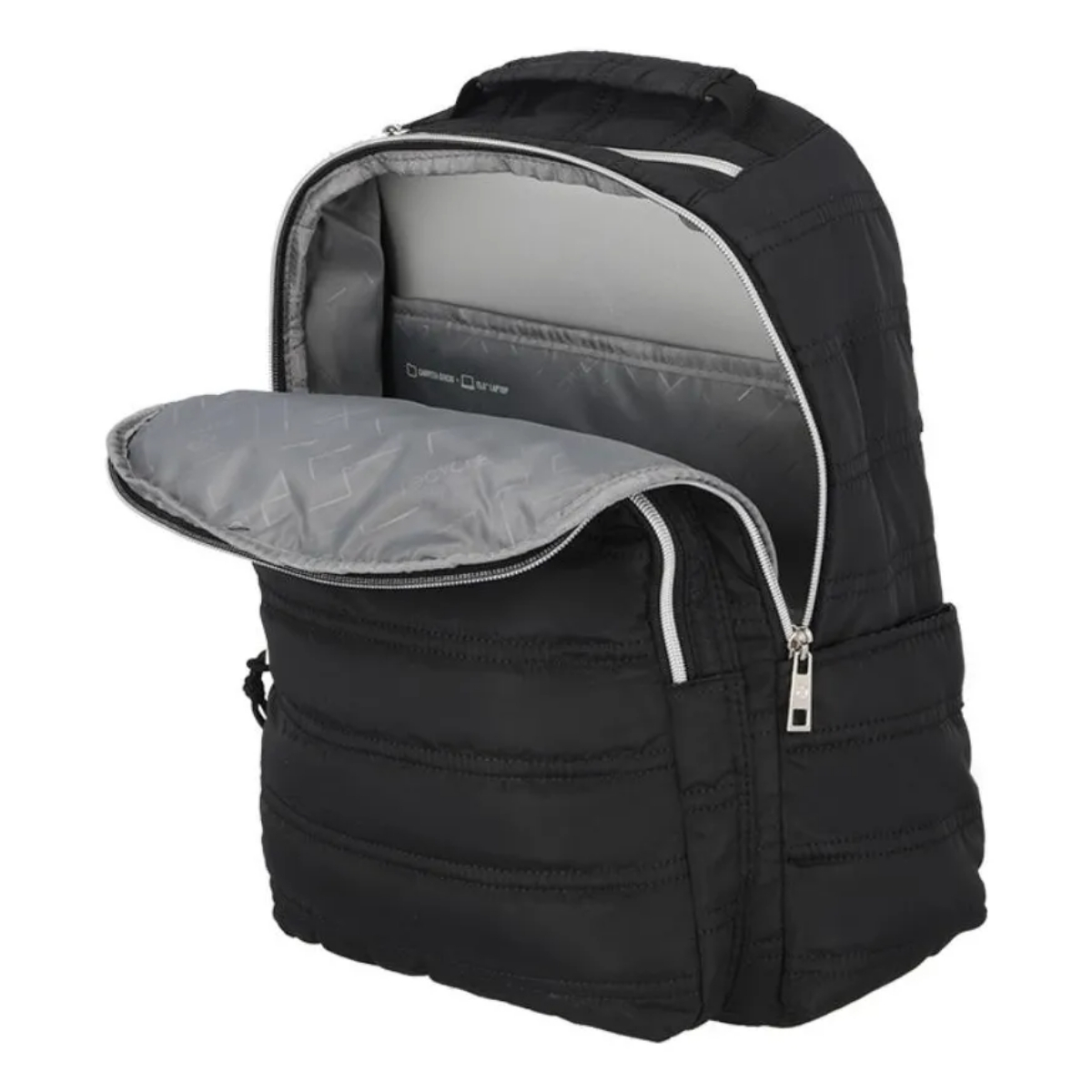 A mochila Vermont, de 27 litros, é nova e por fora é feita de um tecido macio, resistente e acolchoado. Em seu painel frontal, há três compartimentos, o primeiro dos quais é um bolso fundo com zíper, e depois, um bolso retangular para manter as coisas que você precisa ter sempre à mão e um bolso com zíper para óculos. Na lateral um bolso para garrafa e na parte traseira um bolso secreto revestido de MICROBAN, líder antimicrobiano que evitará roubos e micróbios em suas coisas mais valiosas, como celular e carteira.