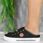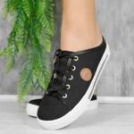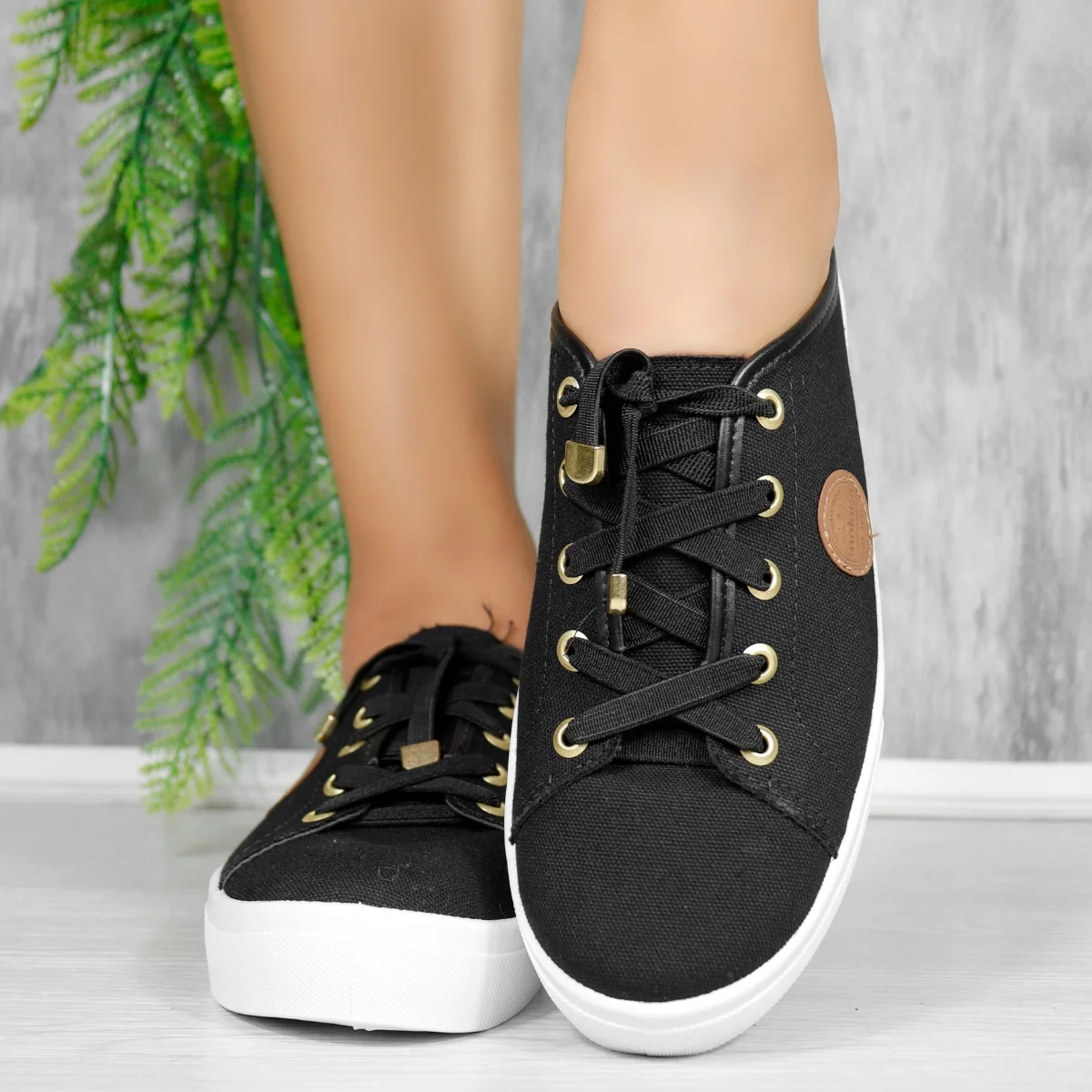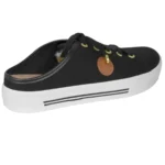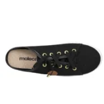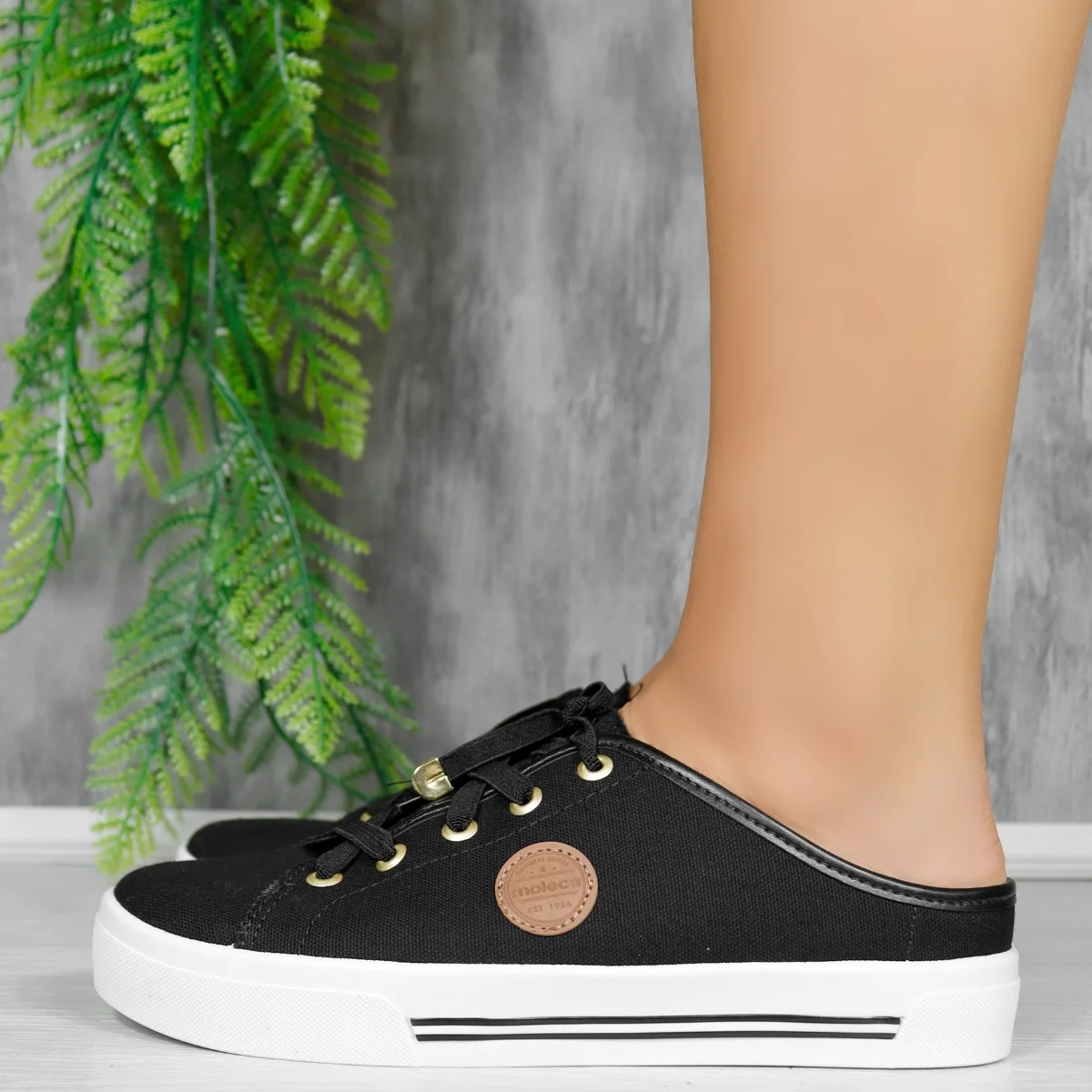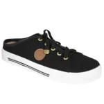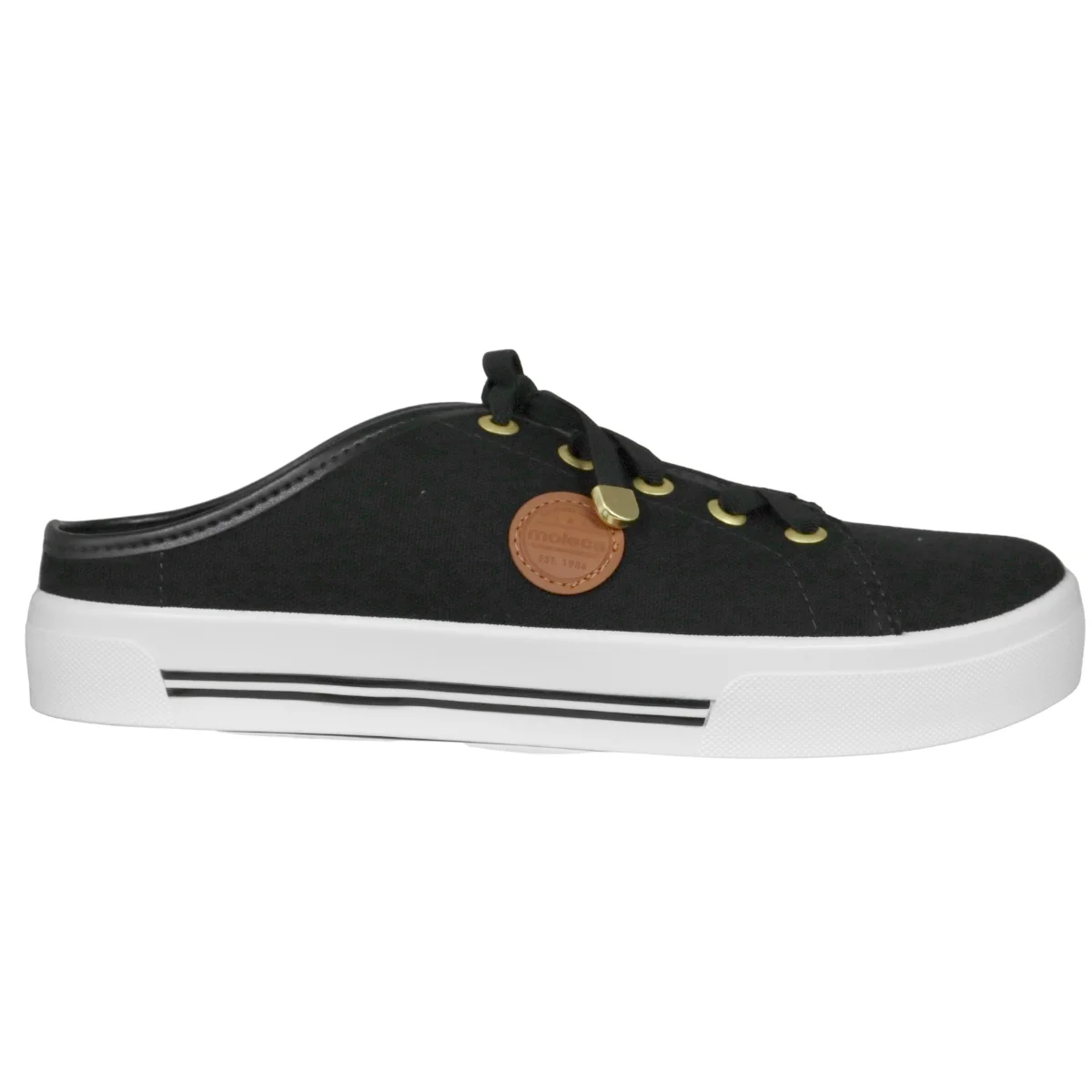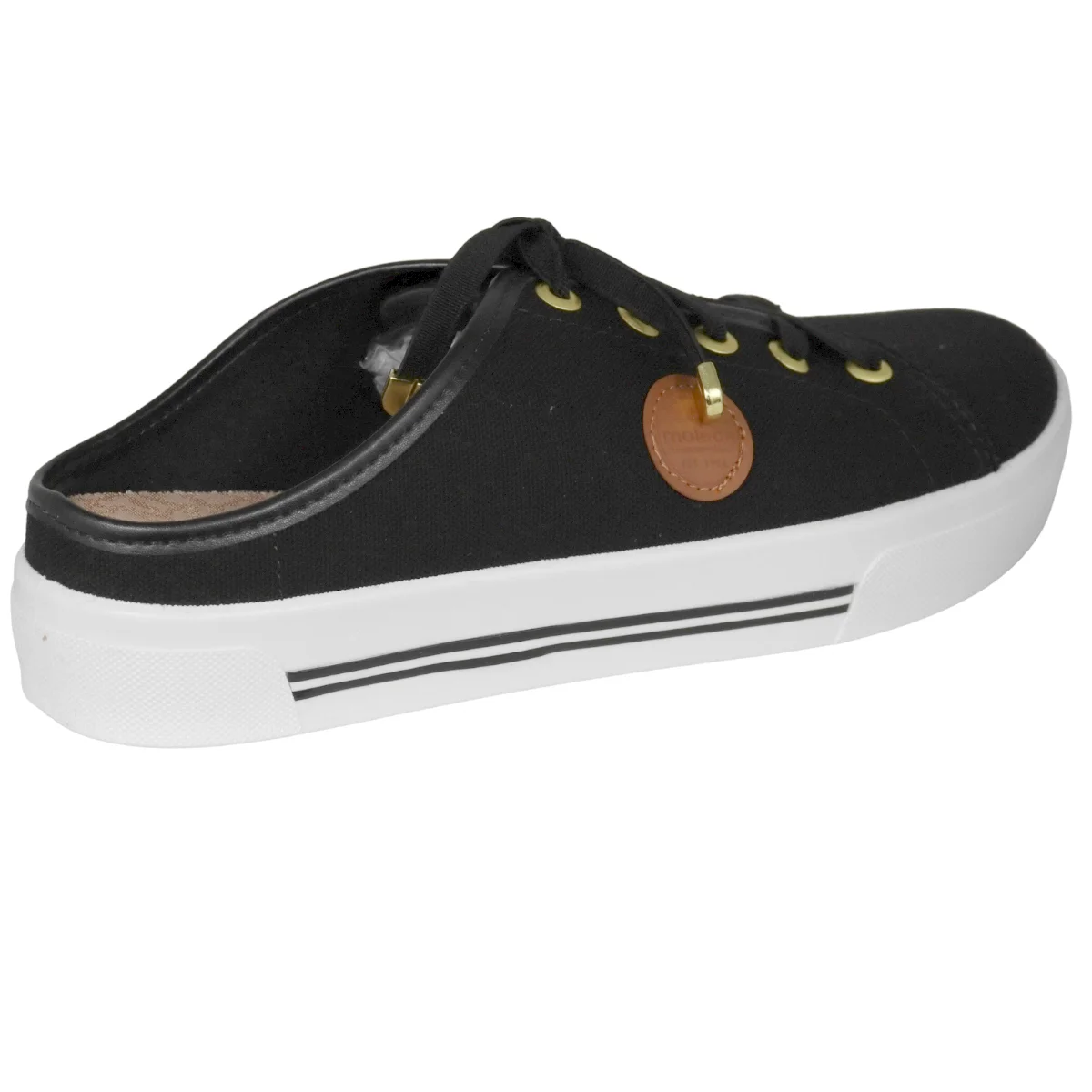 Tênis Mule Moleca feminino, modelo moderno que une estilo e praticidade. Confeccionado em material têxtil preto, possui design aberto no calcanhar, facilitando o calce e proporcionando mais conforto para o dia a dia. Conta com cadarço ajustável, ilhoses dourados e detalhe lateral em patch marrom com a logo da marca. O solado branco emborrachado com listras pretas garante aderência e durabilidade. Versátil, combina perfeitamente com looks casuais como jeans, vestidos e shorts, ideal para quem busca praticidade sem abrir mão do estilo.