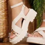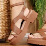 Este modelo apresenta um design moderno com tiras largas e detalhes metalizados, conferindo um toque de sofisticação. O fechamento em fivela e elástico ajustável proporciona segurança e ajuste personalizado, enquanto a palmilha macia garante conforto durante o uso prolongado.