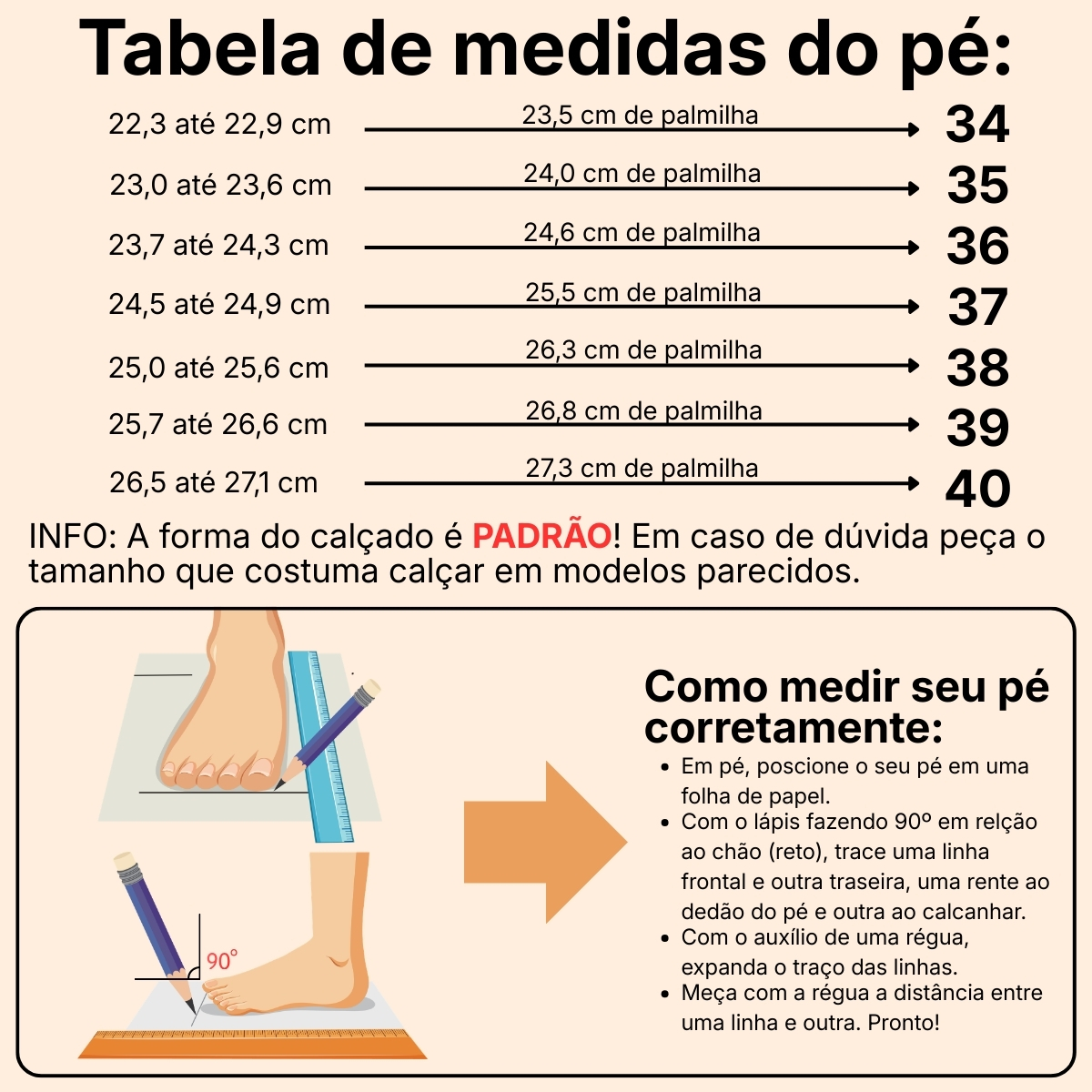 PS: NA FOTO EM QUE O CALÇADO ESTÁ NO PÉ, A MODELO CALÇA 35 NORMALMENTE E ESTÁ USANDO O TAMANHO 35.