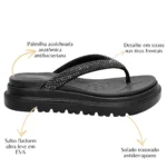 A palmilha super macia, que estimulam a circulação dos pés, ajudando a aliviar a pressão e garantindo conforto por mais tempo. Seu solado antiderrapante de 5 cm na parte traseira e 3 cm na parte frontal oferece estabilidade e segurança em qualquer tipo de superfície.