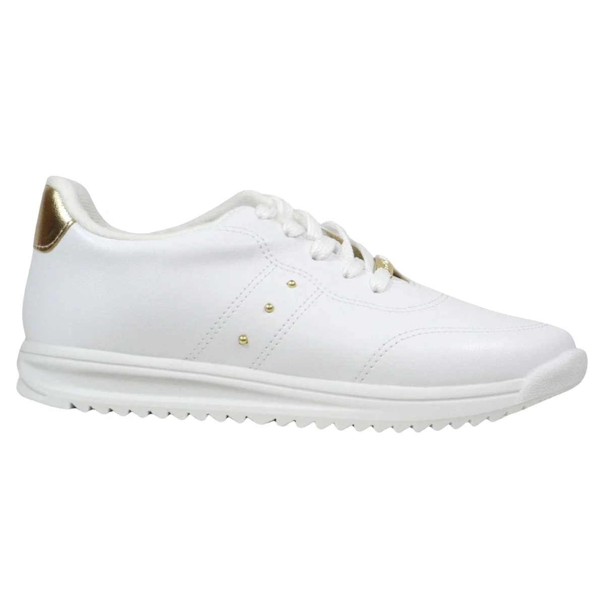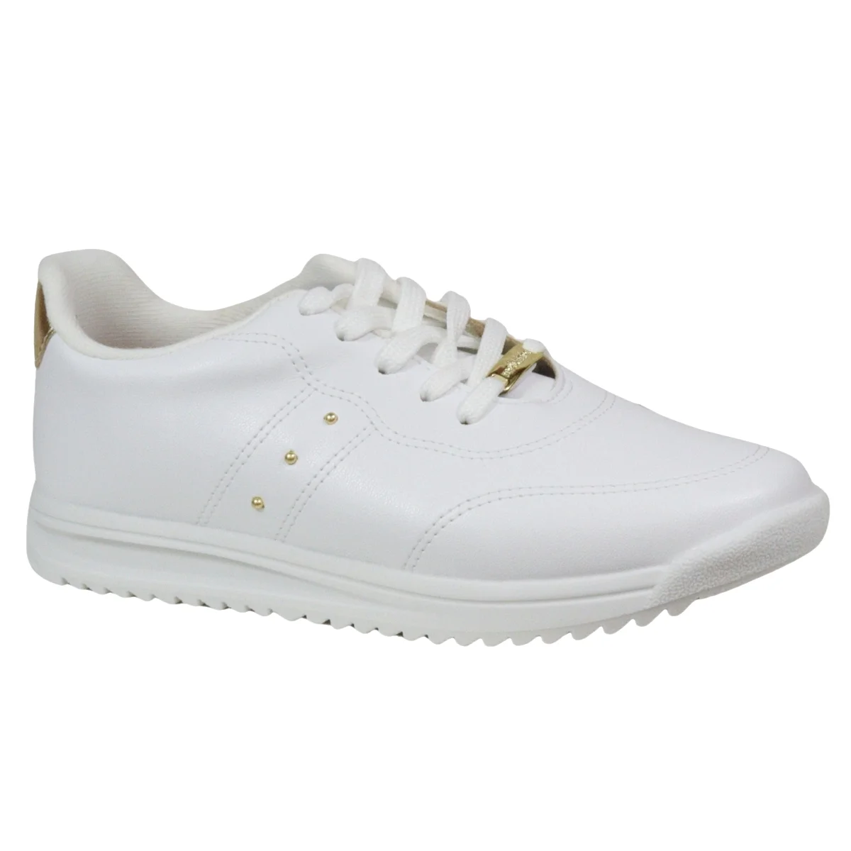 Detalhes Dourados: Apresenta acabamentos na parte de trás com brilho e aplicações na cor dourada, conferindo um charme extra e um visual moderno ao calçado, além de seus detalhes no cabedal e lateral do calçado.